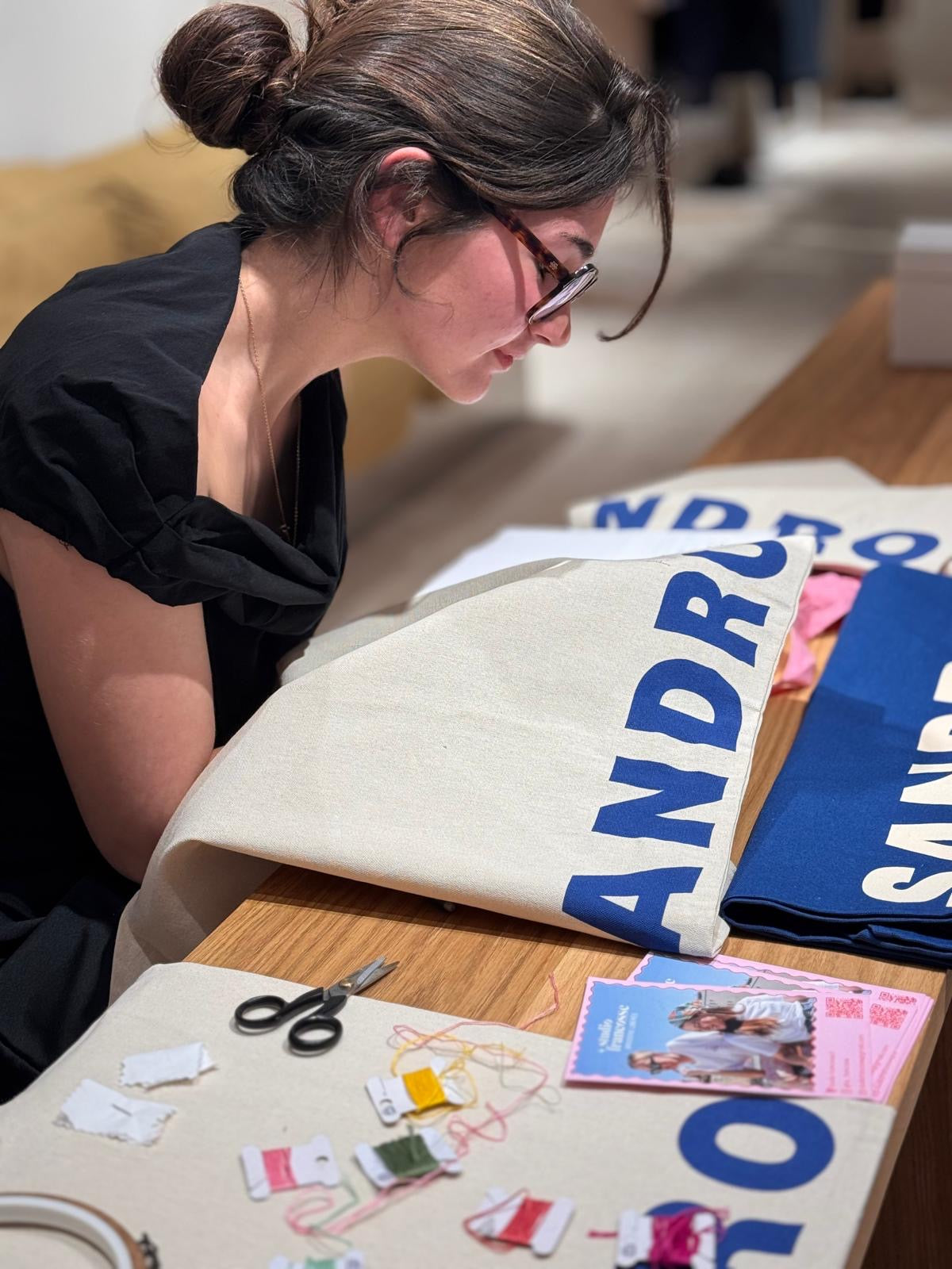 Animation broderie en simultané dans les boutique Sandro à Paris, Londres, Rome et Barcelone. Broderie à la main d'initiales sur totebags Sandro pour les clients VIP.