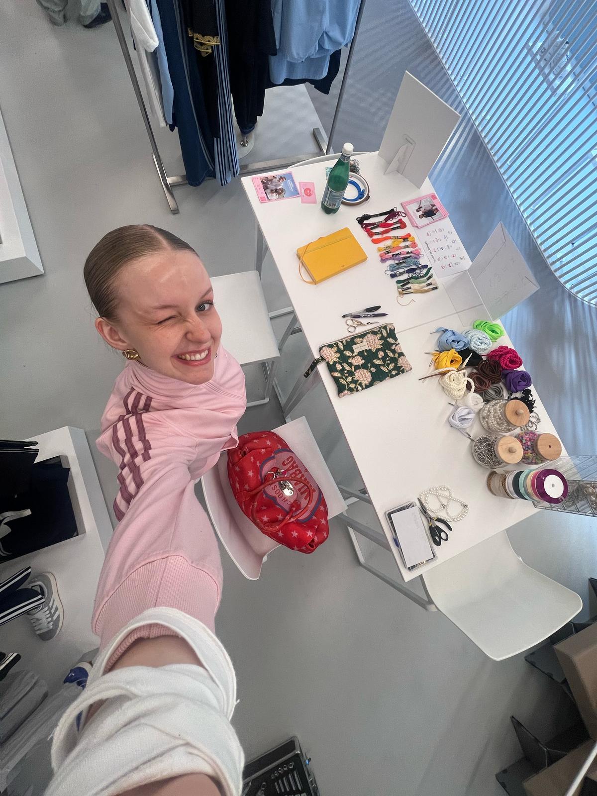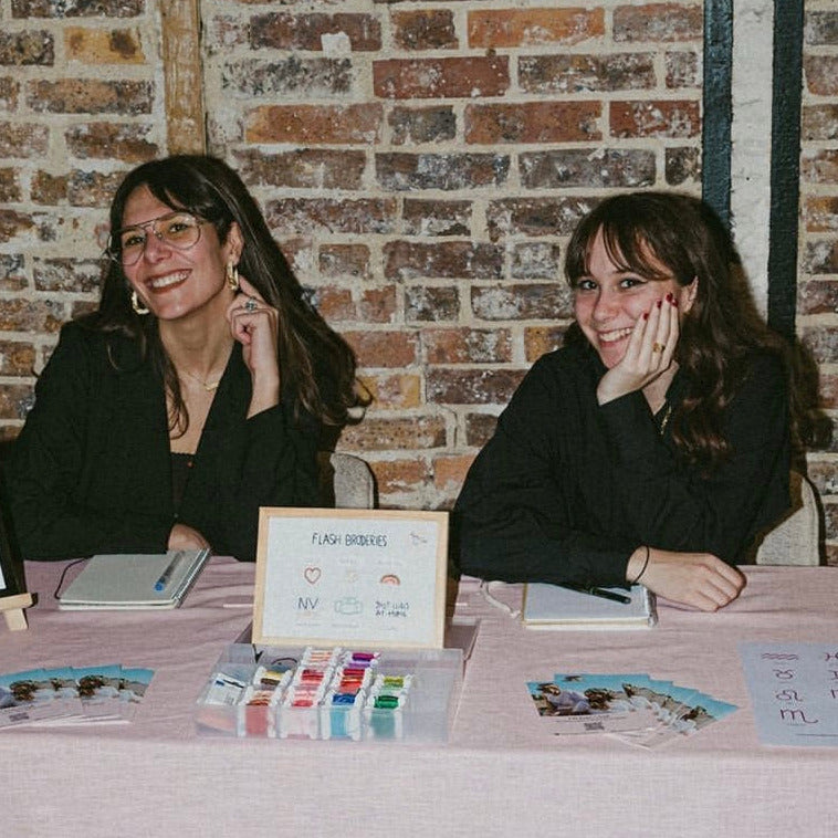 Broderie à la main en boutique de nos flash broderie, proposée aux clients pour tout achat de sac ou banane de la marque Hindbag.