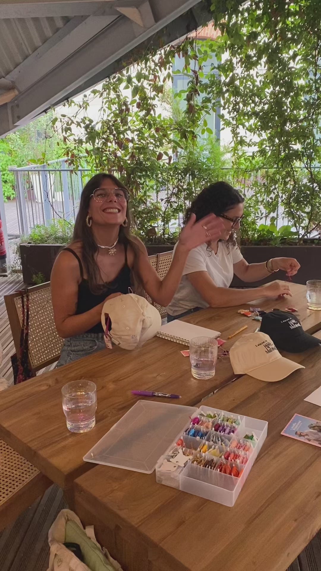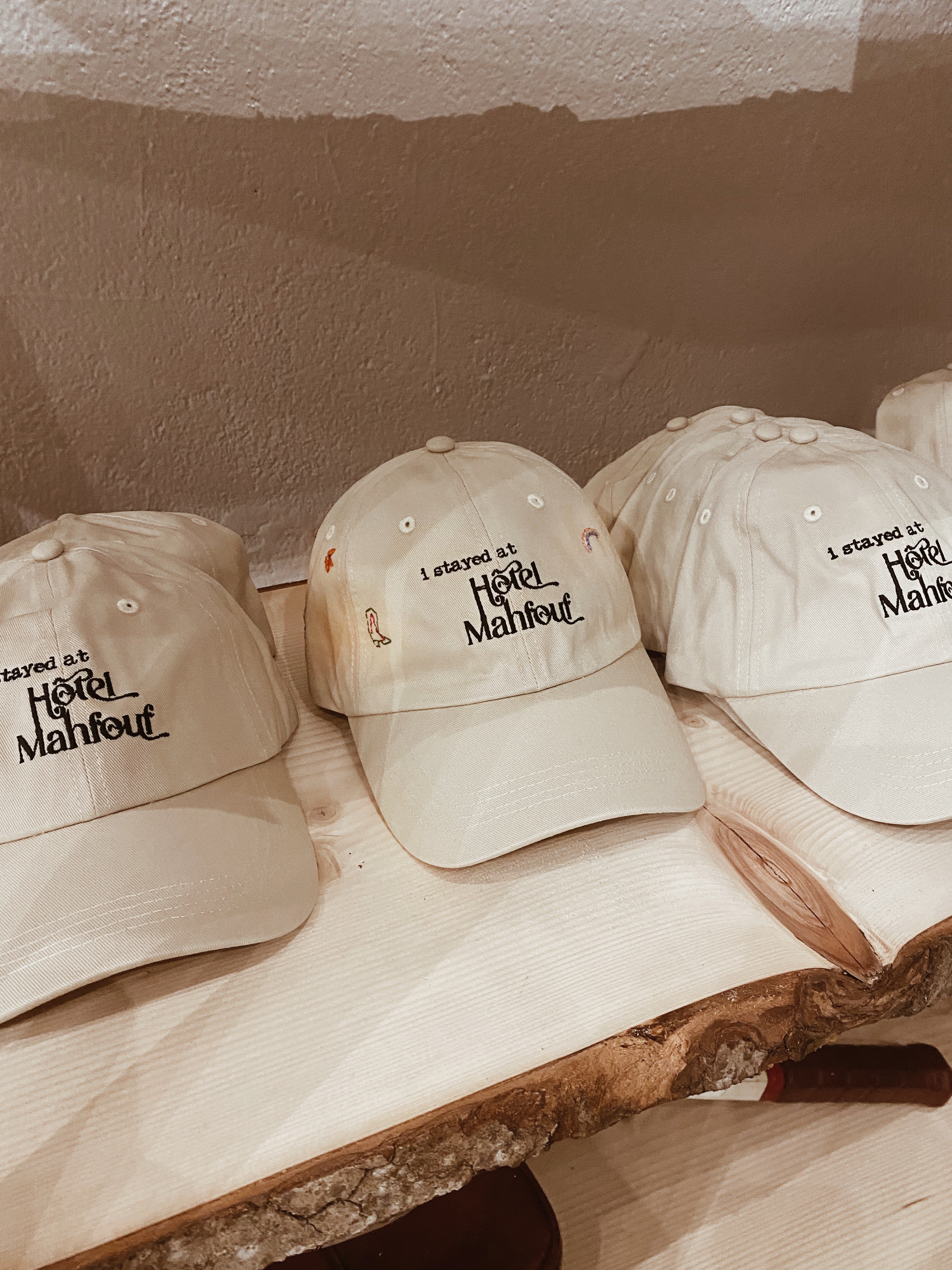 Broderie à la main sur des casquettes Hôtel Mahfouf pour les invités lors d'une soirée influence, et personnalisation de notre planche de flash broderie sur la DA de la marque.