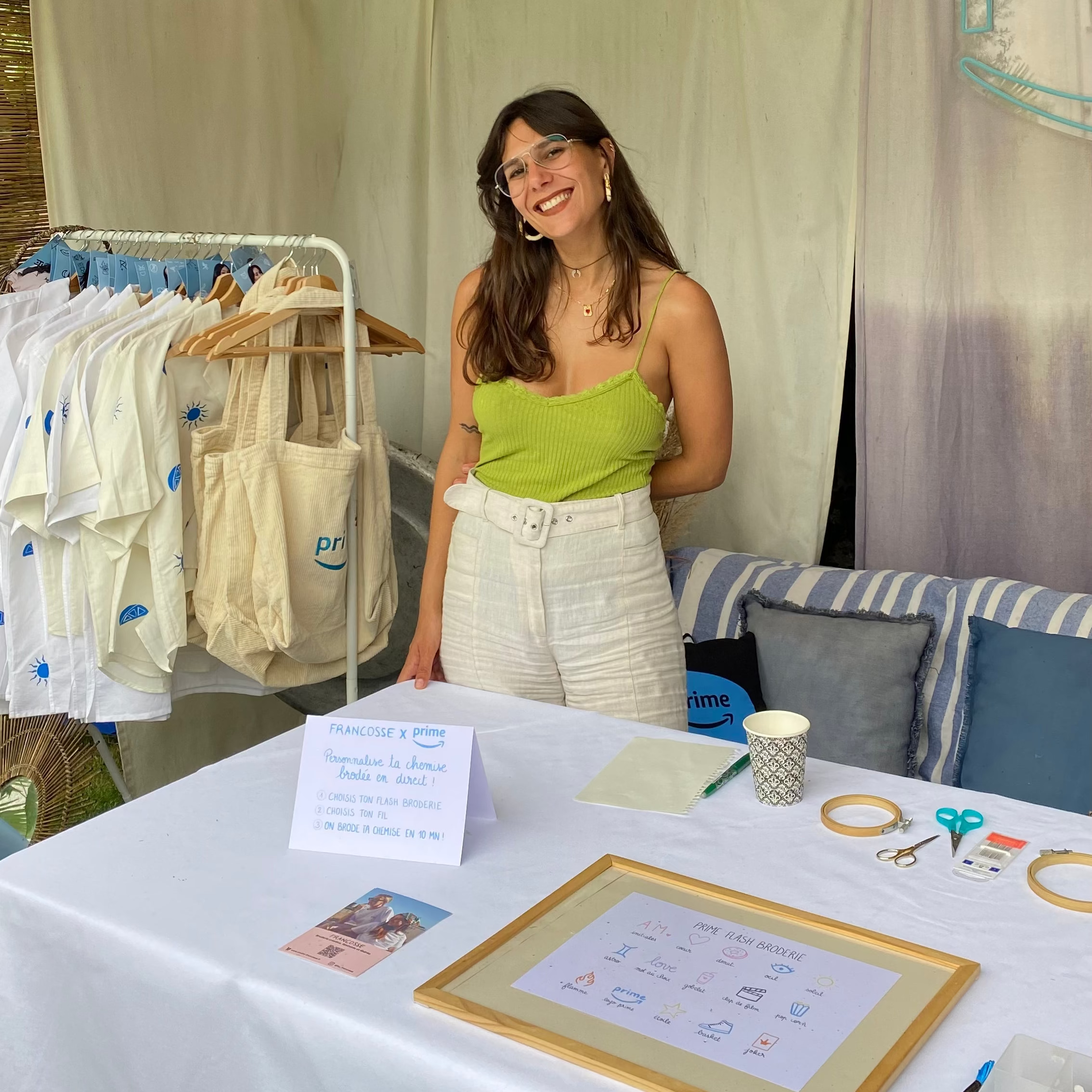 Broderie à la main sur des chemises lors d'une journée influence Prime Video, et personnalisation de notre planche de flash broderie sur le thème USA.