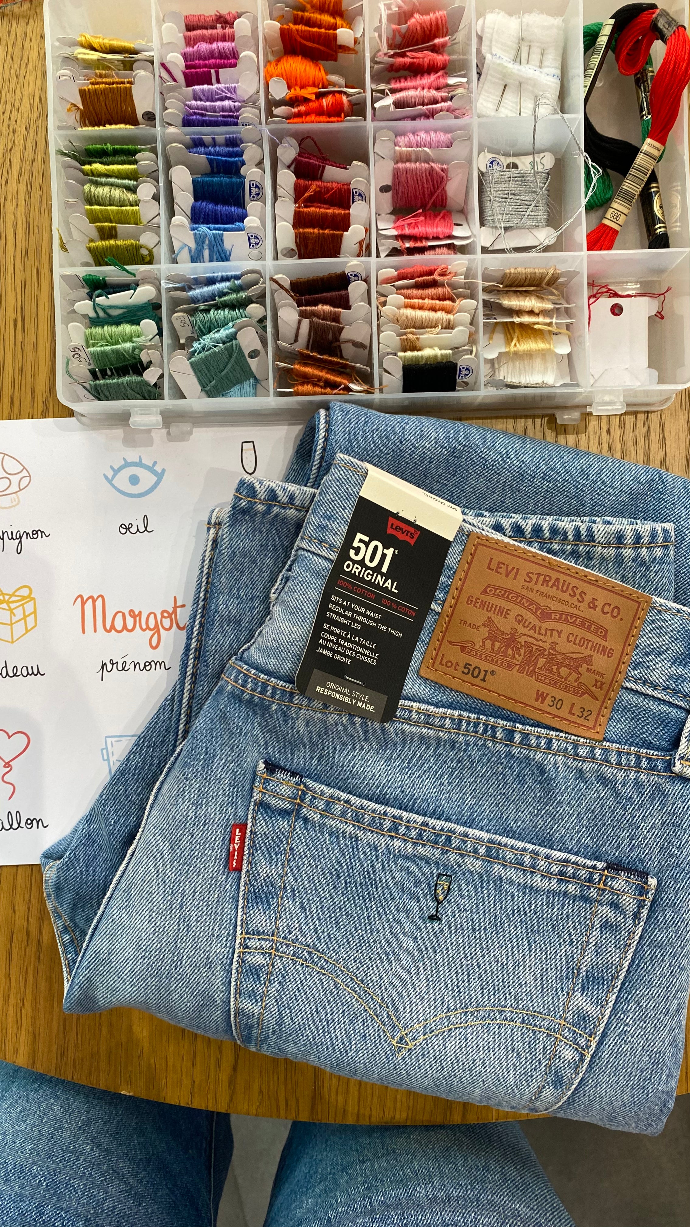 Animation broderie en boutique Levi's sur des jeans et vestes de la marque pour les clients, et personnalisation de notre planche de flash broderie sur le thème des fêtes.