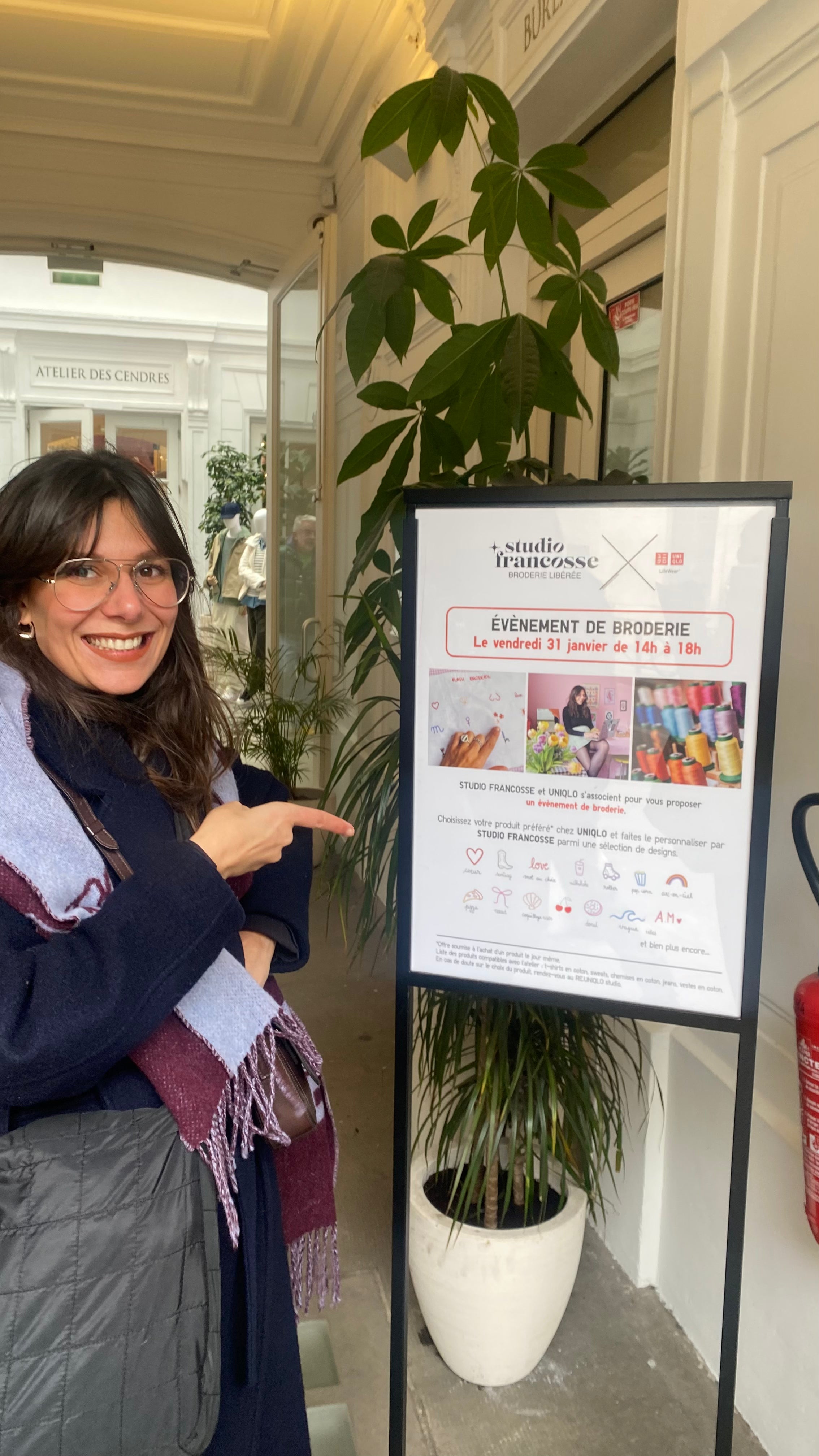 Broderie à la main de nos flash broderie dans la boutique Uniqlo du Marais, proposée aux clients pour tout achat d'un vêtement Uniqlo. Animation d'un atelier broderie à la boutique de Rivoli, sur inscriptions, pour apprendre à broder.